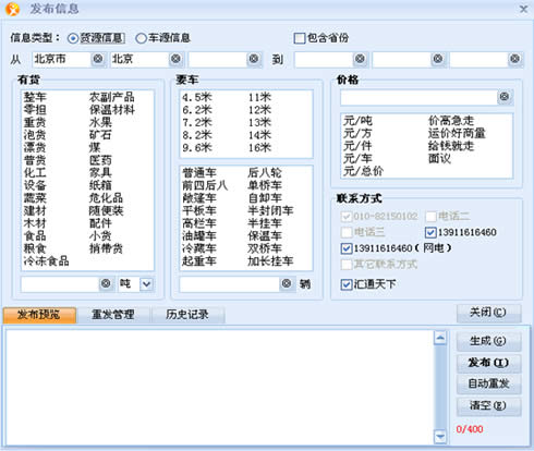 在发布信息窗口中,点“生成”按钮信息将添加到发布框,但并没有发布到服务器,您可以多次添加不同信息,然后点击“发布”按钮一次上传。