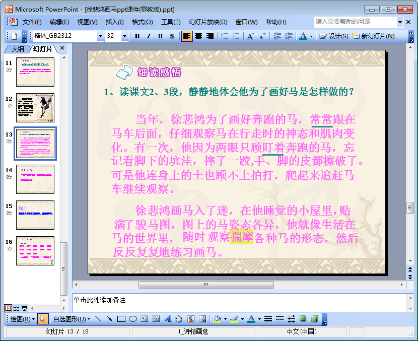徐悲鸿画马是鄂教版小学二年级语文上册第三单元中的一篇课文,本节内容东坡小编为大家整理带来的正是关于这篇课文的ppt课件。该徐悲鸿画马ppt共由16页组成,ppt内容包括作者简介,课文导入以及课堂练习等,是一份设计十分精巧的ppt课件。如果你需要这份徐悲鸿画马ppt课件的话,只需点击本文相应的下载地址进行下载即可!