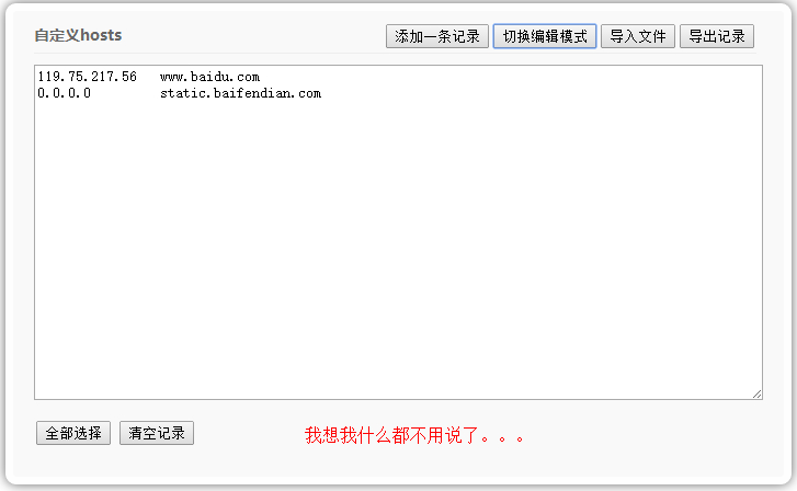 极路由增强组件是一个基于UserScript的增强组件。极路由支持自定义Hosts,可惜的是官方提供的编辑工具永恒的一行编辑器,只能一行一行加,一行一行删,不能导入什么的。所以写了这个编辑器。基本功能就是,你可以直接在编辑界面导入,导出,改用传统的编辑器编辑……
