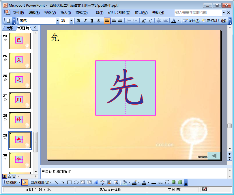 作为西师大版二年级语文上册第一单元中的第一篇课文,三字经的重要意义小编自不必多言。小编在此要介绍的是,下文是小编为大家整理带来的这份三字经ppt课件的内容节选,如果你需要一份完整全面的西师大版二年级语文上册三字经ppt课件的话,则只需点击本文相应的下载地址进行下载就可以啦!该课件共34页,内容完全免费,欢迎前来东坡下载!