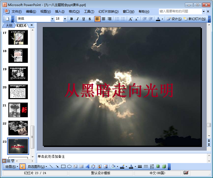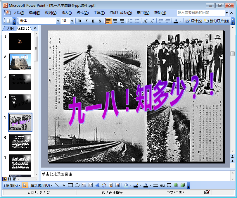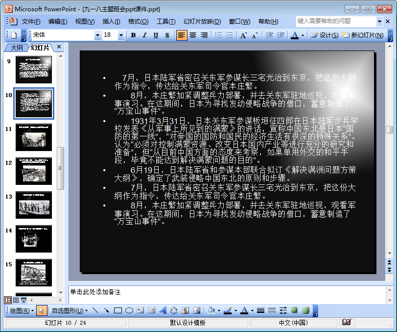 之前本站小编曾为大家整理带来了一份由15页组成的纪念九一八主题班会课件ppt,在本节内容中东坡小编继续为大家带来可供九一八主题班会使用的ppt课件——一份由24页组成的九一八主题班会ppt课件,希望同样对大家有所帮助!有需要的朋友只需点击本文相应的下载地址进行下载就可以了。