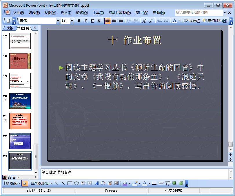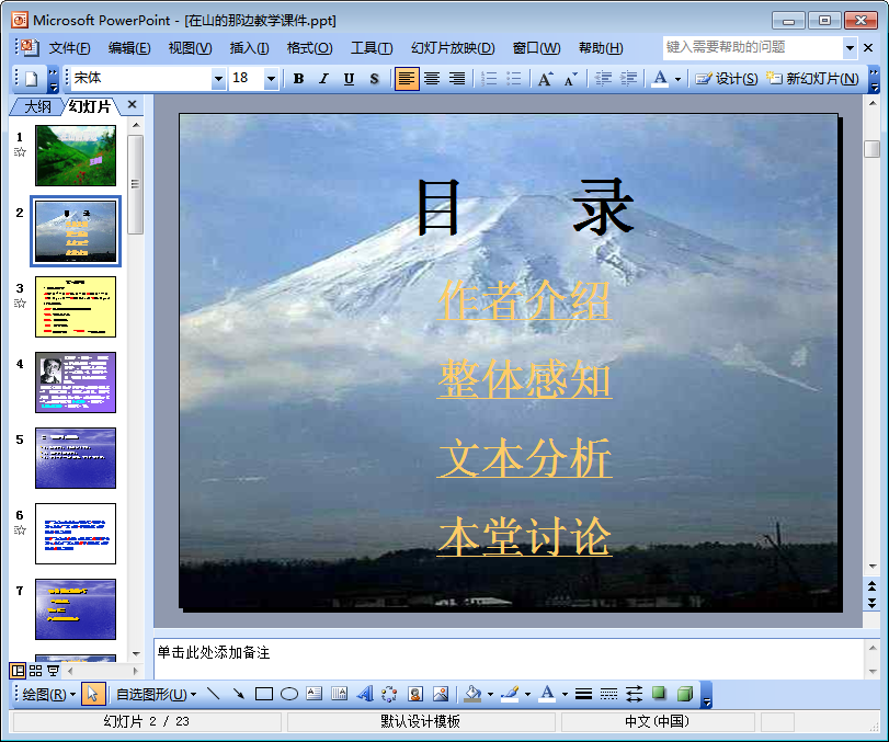 该在山的那边教学课件ppt共分为作者介绍、整体感知、文本分析、本堂讨论四大部分,是一份内容十分详细且全面的课件。该ppt课件共由23页组成,如果你需要这样一份课件的话,只需点击本文相应的下载地址进行下载即可!该ppt课件完全免费,有需要的朋友快来东坡下载吧!