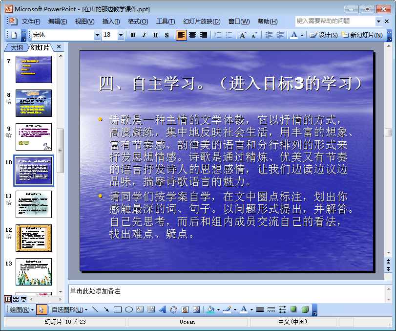 诗歌是一种主情的文学体裁,它以抒情的方式,高度凝练,集中地反映社会生活,用丰富的想象、富有节奏感、韵律美的语言和分行排列的形式来抒发思想情感。诗歌是通过精炼、优美又有节奏的语言抒发诗人的思想感情,让我们边读边议边品味,揣摩诗歌语言的魅力。