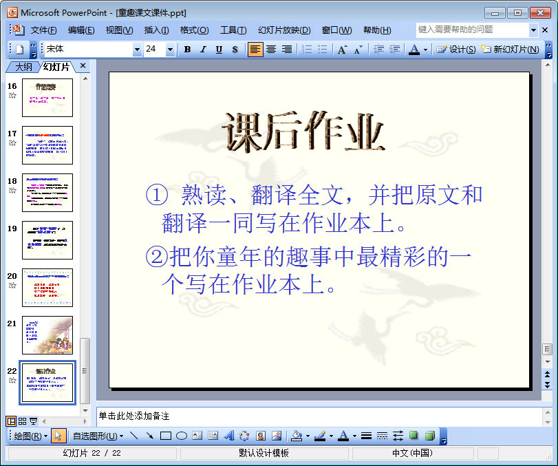 ① 熟读、翻译全文,并把原文和翻译一同写在作业本上。