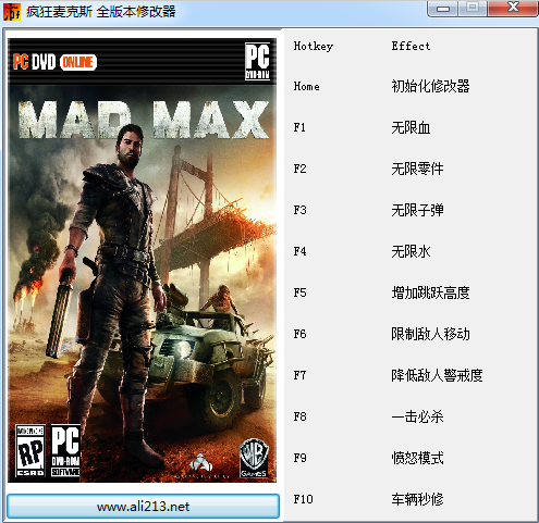 疯狂的麦克斯全版本九项修改器是一款非常不错的游戏修改器。支持无限血、无限子弹等等功能。有需要的可以来东坡下载使用!