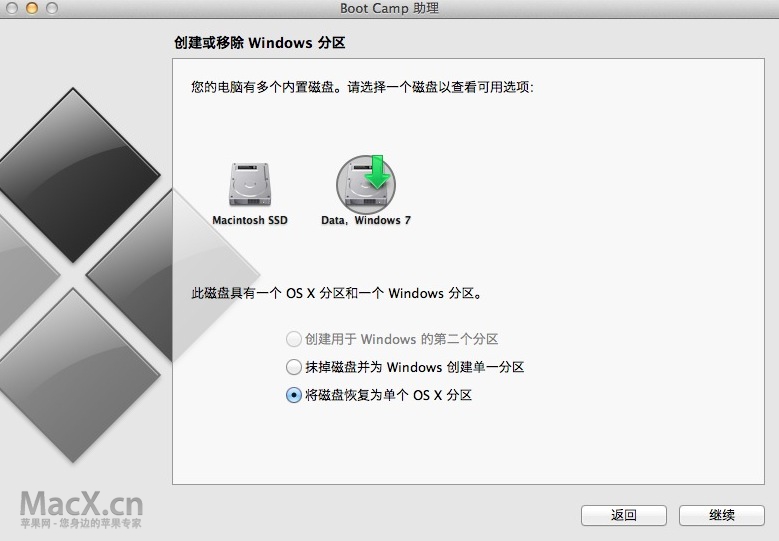 镜像保存完毕后,打开Bootcamp实用工具,按下图将磁盘恢复为单个分区(我的电脑上有两块硬盘,所以显示的情况可能稍有不同。合并时不用担心,Mac分区上的内容不会有危险。)