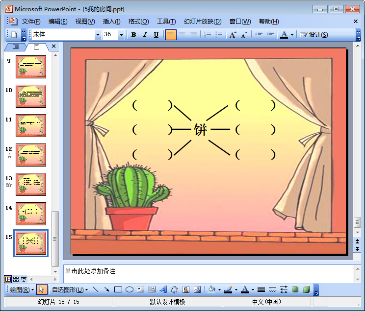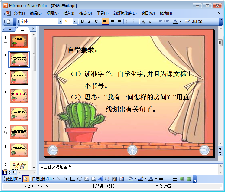 该我的房间教学课件共有15页,课件内容主要围绕读准字音,自学生字,并且为课文标上小节号、我有一间怎样的房间?用直线划出有关句子两大教学目标进行,是一份十分具有引导性的ppt课件,下文是关于该ppt课件的内容简介,需要下载该课件的朋友们只需点击本文相应的下载地址进行下载即可!
