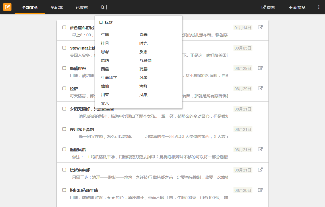没有多余内容的管理界面,快速创建和查找文章。