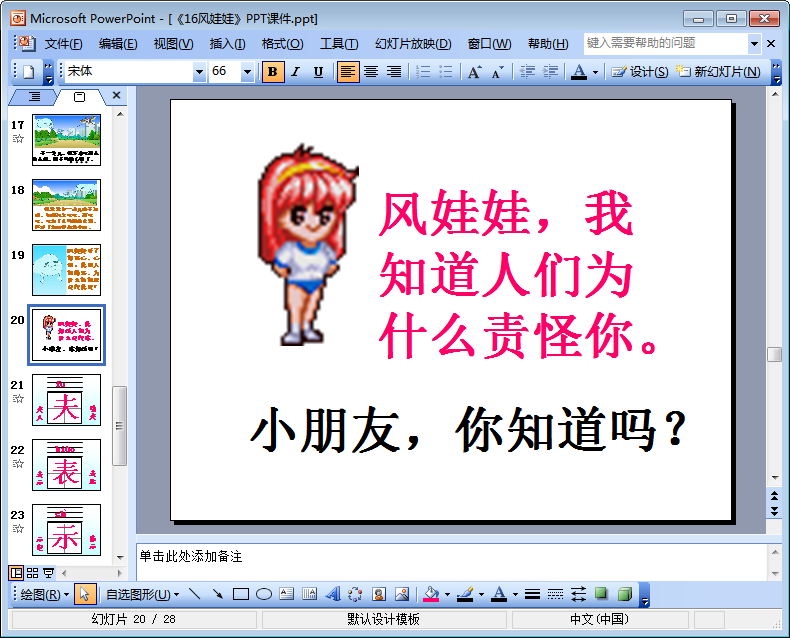 该人教版二年级语文上册ppt课件之风娃娃课文课件充满童真童趣,共由28页组成。其中内容图文并茂,妙趣横生,包括课文导读以及重难点词句解析等,是一份非常具有引导性的课文课件,欢迎有需要的朋友们前来下载使用该风娃娃ppt课件。