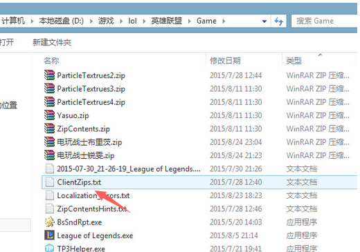 1、将下载好的皮肤包“锐雯-胡萝卜.zip”粘贴至你的英雄联盟game文件夹(英雄联盟\Game)下。 2、进入该game文件夹粘贴好皮肤包之后,点一下“类型”进行排序,在各种压缩包的最下面有个名字为“ClientZips.txt”的文本文件