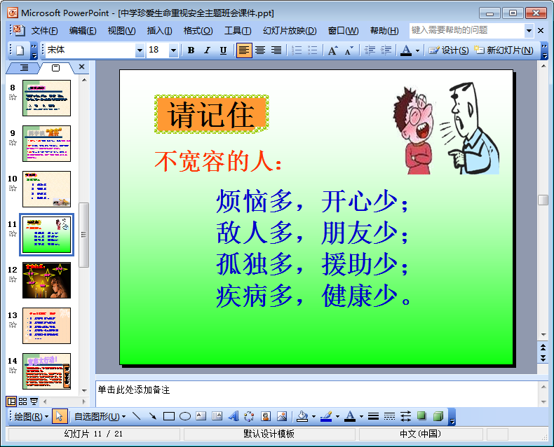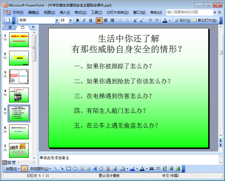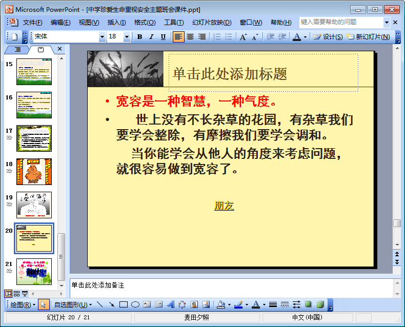 这是一份珍爱生命班会ppt——全称为珍爱生命重视安全主题班会课件ppt,该ppt课件共由21页组成,适合中学阶段作为班会课件使用。该ppt内容十分具有教育意义,如果作为中学班主任老师的你,需要一份珍爱生命班会ppt的话,那么该中学珍爱生命重视安全主题班会课件将会是你一个不错的选择哦!