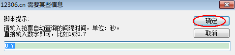 6. 查询间隔对话框,点击确定即可。可将查询间隔由12306默认的5秒修改为0.7秒