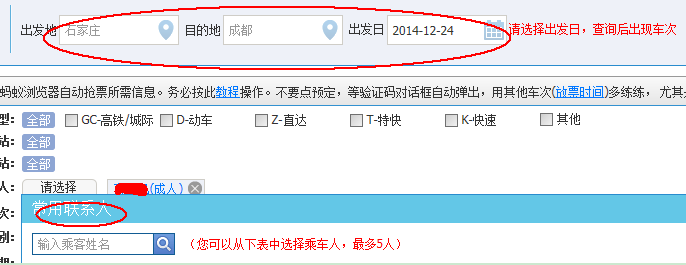 7. 勾选乘车人,输入出发地目的地,选择出发日期即设置完毕