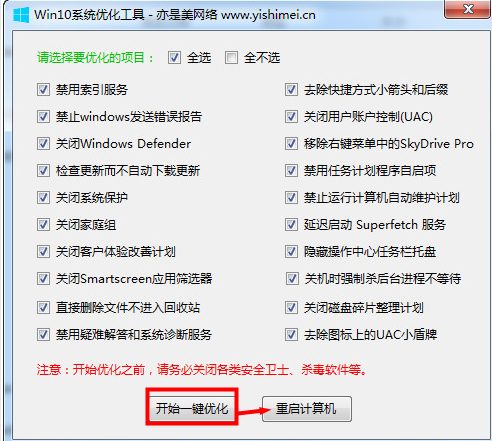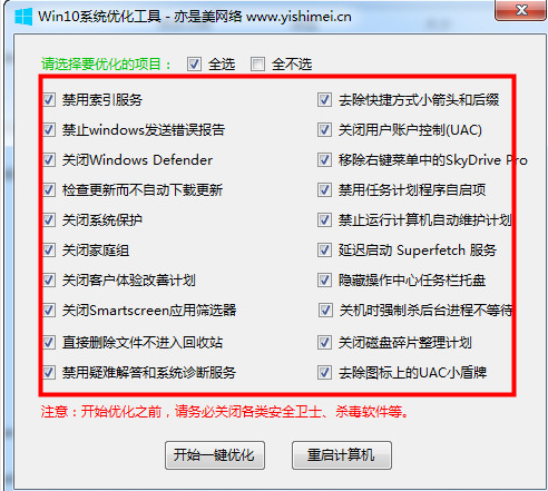 2、程序优化时,涉及到注册表、服务的修改,为确保不出现意外错误,请务必关闭各类安全卫士、杀毒软件等。