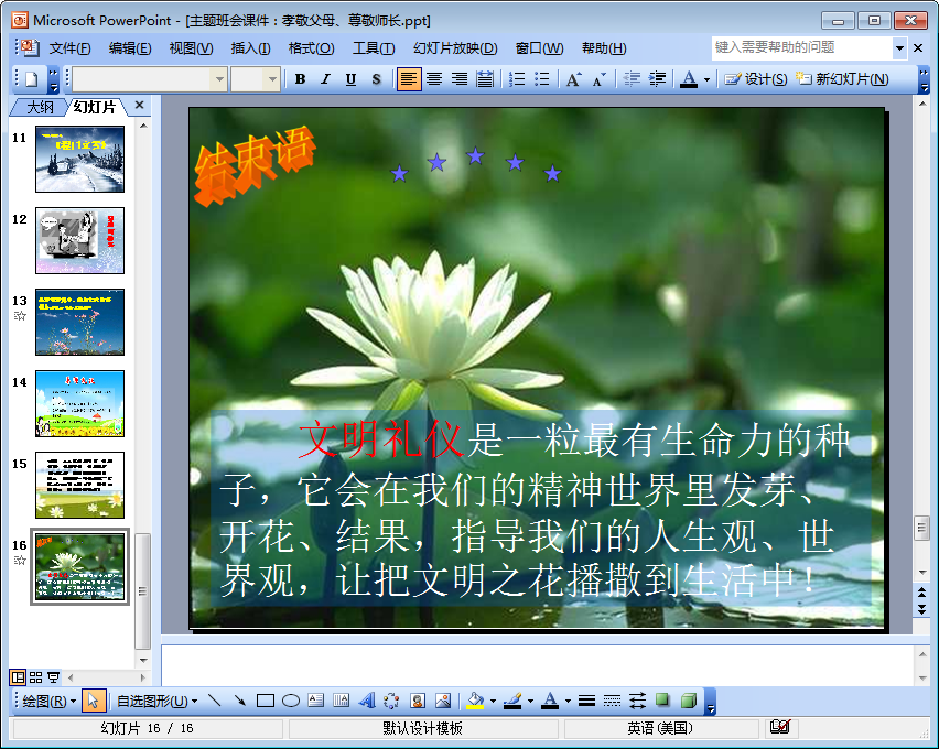 这是一份主题为“孝敬父母尊敬师长”的课件,适合作为主题班会课件使用(以下简称为尊敬师长ppt)。该尊敬师长ppt共由16页组成,内容主要围绕“孝敬父母尊敬师长”八个字展开,下文是关于该ppt课件的内容简介,如果你想要查阅该ppt课件的全部内容的话,点击本文相应的下载地址进行下载即可!