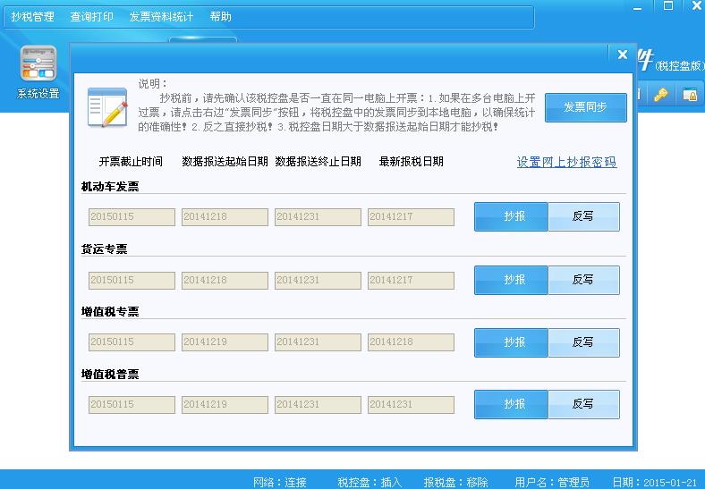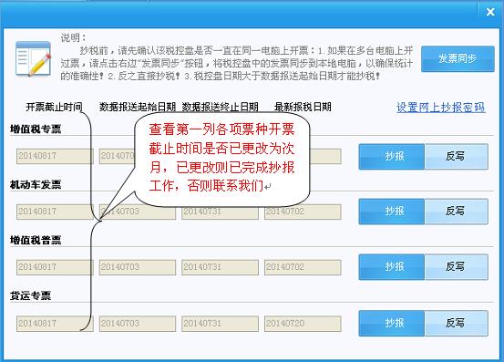 (1)抄税前,请先确认该税控盘是否一直在同一电脑上开票,如果在多台电脑上开过票,请点击右边“发票同步”按钮,将税控盘中的发票同步到本地电脑,以确保领用存数据统计的准确性。
