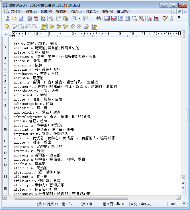 这是一份doc格式word版2016考博英语词汇速记手册,可进行打印使用。有人说它堪比2016考博英语词汇10000例精解,如果你想一探究竟的话,那么就点击本文相应的下载地址将这份考博英语单词下载下来仔细琢磨一下吧!相信它不会让你失望的哦!