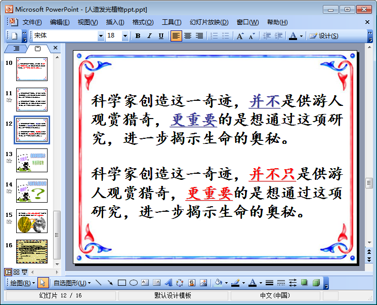 人教版四年级语文上册人造发光植物教学课件ppt一般被简称为人造发光植物ppt,该ppt课件共由16页组成,课件主要围绕“大声读课文,做到读准字音,读通句子,难读的地方多读几遍”以及“想想文章主要讲了什么内容”两大教学目标展开,是一份非常详细完整的课件,欢迎有需要的朋友们前来下载!