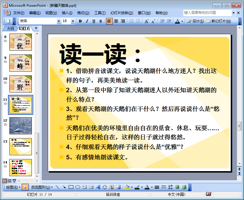3、观看天鹅湖的天鹅们在干什么?然后再说说什么是“悠然”?