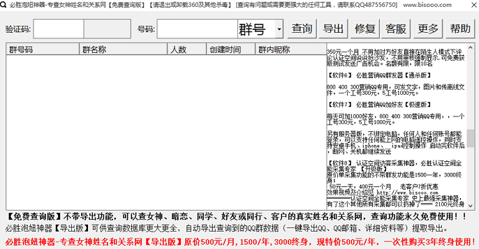 必胜泡妞神器【导出版】可供查询数据库更大更全,自动导出查询到的QQ群数据(一键导出QQ、QQ邮箱、详细资料等)提取导出。