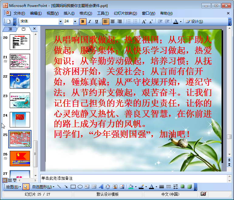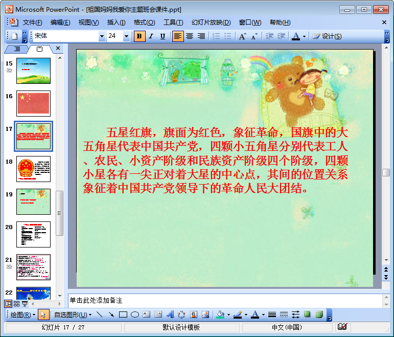 这是一份内容十分优秀的ppt课件——一份由17页组成的祖国妈妈我爱你主题班会课件(以下简称为祖国妈妈我爱你ppt),如果你想要召开一次主题为“祖国妈妈我爱你”的主题班会,但又没有可直接进行使用的内容资料,那么不妨就来参考一下这份祖国妈妈我爱你ppt吧!欢迎有需要的朋友们前来东坡进行下载!