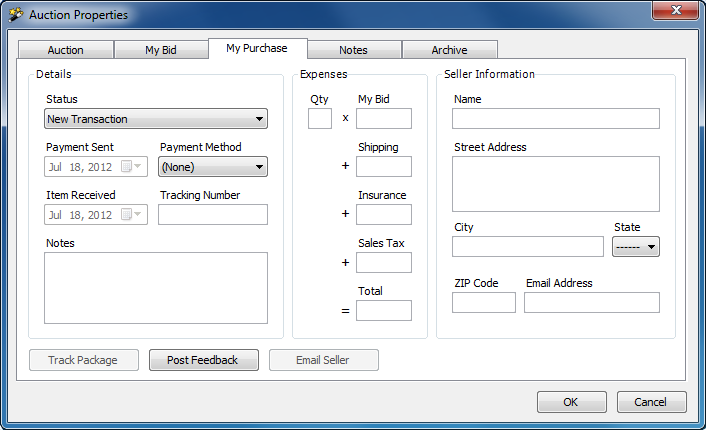 你购买跟踪拍卖,包括接触和跟踪信息、日期和成本。 它还存储完整的复制项的描述和图片,所以你会有一个记录即使它改变或当eBay最终删除它。