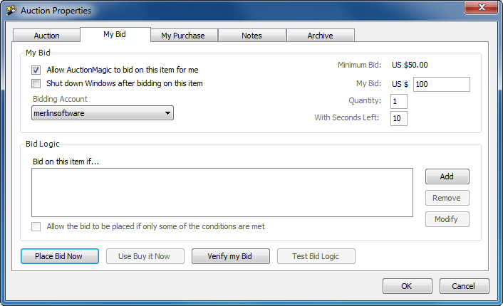 下面就是你会设置自动投标,它可以使用不同的货币。 它还支持多个易趣帐户。收购逻辑让你挑选你的列表和其他拍卖竞标这个项目根据他们的结果,赢或输。 您可以验证您的报价是有效的,一切都正确设置。