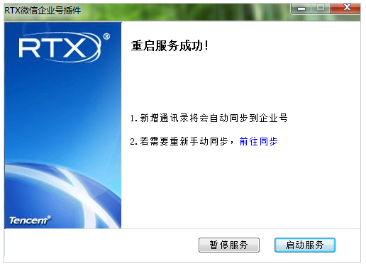 确认rtx微信插件是否是正常运行的,若是服务已暂停,请重启服务后再手动同步。