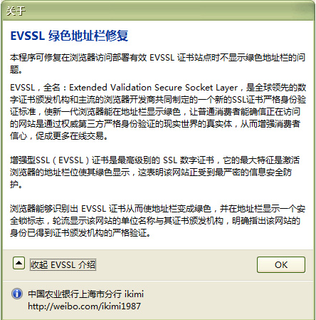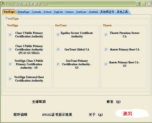 这时大家可以使用《EVSSL 绿色地址栏修复》进行系统修复,程序已经囊括了大伙儿经常访问的部署有EVSSL证书的站点之根证书颁发机构签发的多份根证书,方便大家迅速消除地址栏无法绿色显示的烦恼。