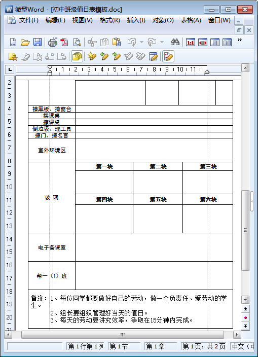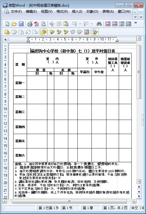 这份初中班级值日表模板为doc格式word打印版,表格编排得十分完整,说明也非常详细,总之,这是一份非常好用且值得借鉴参考的初中值日生安排表,下文是关于该表格的介绍及预览图,欢迎有需要一份初中班级值日表模板的朋友们前来东坡下载!