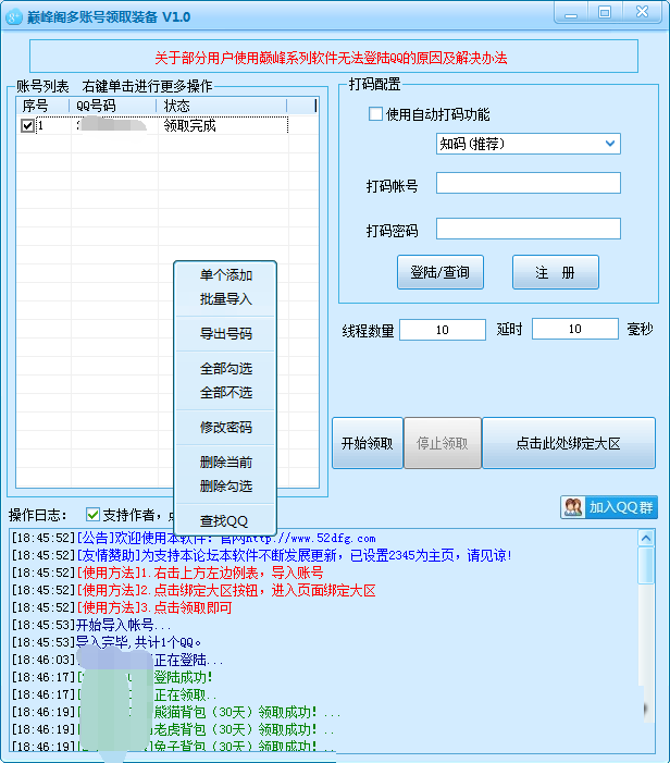 巅峰阁多账号领取装备是专门针对CF兰的秘密基地活动制作的领装备软件,省去手动逐个点击领取的繁琐步骤,直接一键领取,支持多账号操作,方便多小号的玩家使用。尽管领取的装备有时间限制,但是能爽一天是一天,你说呢?