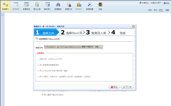 第一步:如上图,点击“模版导入”图标,选择本地根据模版编辑好的Excel文件(注:最好格式为office2007、2010格式),文件选择完毕后,点击【下一步】