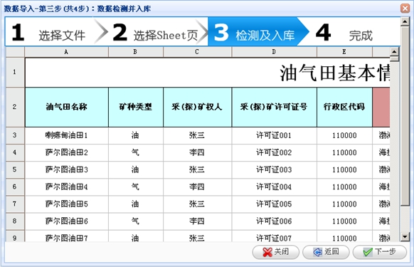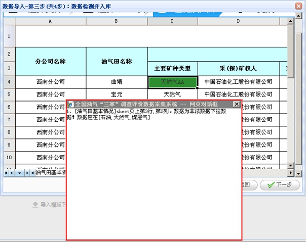 检测:数据显示后,点击【下一步】按钮,系统自动检测数据项是否符合设定的规则,在弹出窗口中提示填写错误的数据,页面使用不同颜色显示出错信息的单元格,用户修改后,方可入库。若数据项没有错误,直接点击【下一步】。