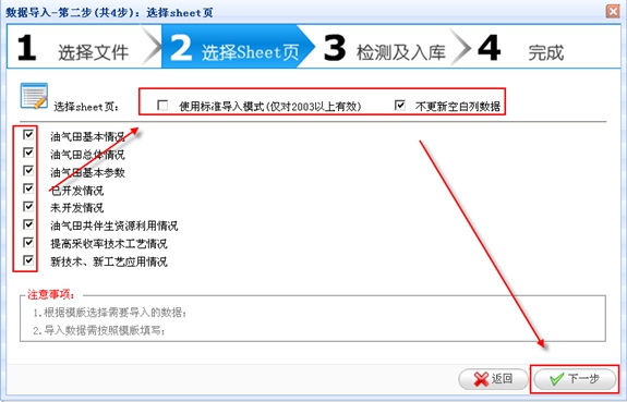 第二步:选择需要导入系统的内容。由于模版中,各信息按照sheet页分开采集,故,系统中用户可根据需要导入所需数据(默认导入所有数据)。选择完毕后,点击【下一步】
