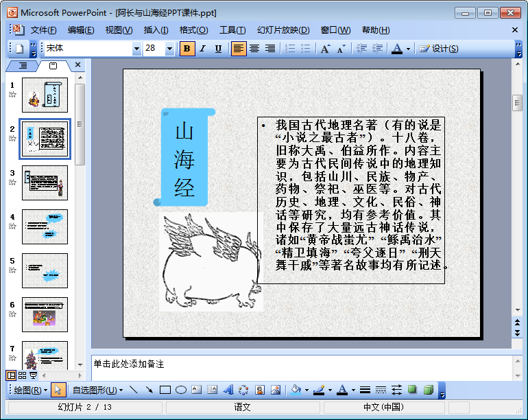 该人教版八年级语文上册课件之阿长与山海经课文教学课件为ppt形式,共由13页组成,内容包括课文背景介绍、课文导入以及拓展训练等,是一份设计得比较周全且整个框架看上去清晰明了的ppt课件,欢迎有需要的朋友前来东坡下载!