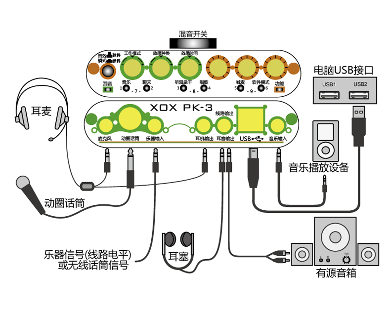带伴奏音乐输入和乐器输入,可以接驳无线话筒等外围设备,也可提供脱离电脑卡拉OK的能力。