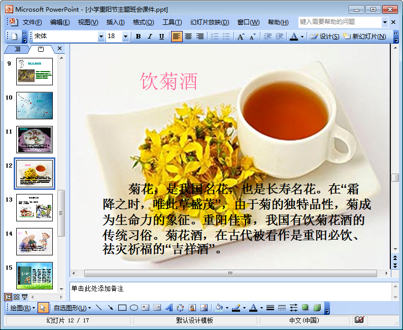 九九重阳节,如何让小学生们对这一节日有更多地了解和认识呢?本节内容东坡小编为大家整理带来的是一份内容完全免费的、共由17页组成的重阳节主题班会ppt之小学重阳节主题班会课件,该课件详细介绍了重阳节的由来习俗等相关知识,图文并茂,十分便于小学生理解和接收其中的知识点,希望这样一份ppt课件能对大家有所帮助!