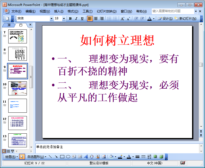 这是一份关于理想的主题班会课件——一份适合高中阶段在理想与成才主题班会课上进行演示的课件ppt。该关于理想的主题班会ppt共有22页,内容十分有趣,寓教于乐,具有很强的引导性。下文是关于该高中理想与成才主题班会课件的内容节选及预览图,需要这份课件的朋友们只需点击本文相应的下载地址即可下载查阅全部内容!