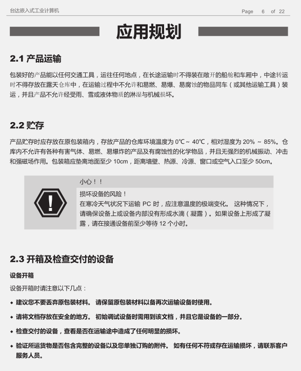DIAVH-IPC00X100 是一款低功耗、高性能、高可靠、无风扇的嵌入式工业计算机产品,整机高强度优质铝合金材质,高密度铝合金散热器。本产品板载 Intel 低功耗 Core I3-3227U/I5-3337U CPU,最大可扩展 8GB DDRIII 内存,整机具有丰富的I/O 接口,采用密封无风扇设计。支持 WindowsXP、Windows7、Linux 等操作系统。本产品可广泛应用于机械设备、智能交通,工业自动化控制等各种嵌入式领域。——欲知更多关于这款产品的信息,敬请下载该pdf格式高清电子版台达说明书之台达嵌入式工业计算机使用手册进行了解!