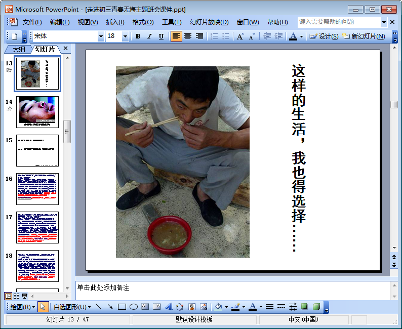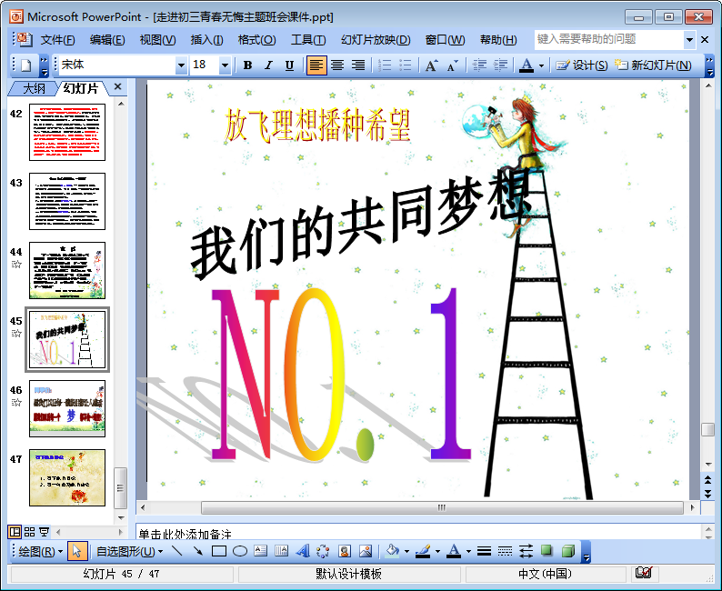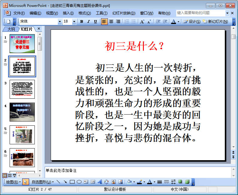 该初三主题班会ppt之走进初三青春无悔主题班会课件共由47页组成,内容十分详细且法人深思,是一份非常具有教育意义和启发性的课件ppt,下文是关于该走进初三青春无悔主题班会课件的介绍,欢迎有需要的朋友们前来下载查阅!