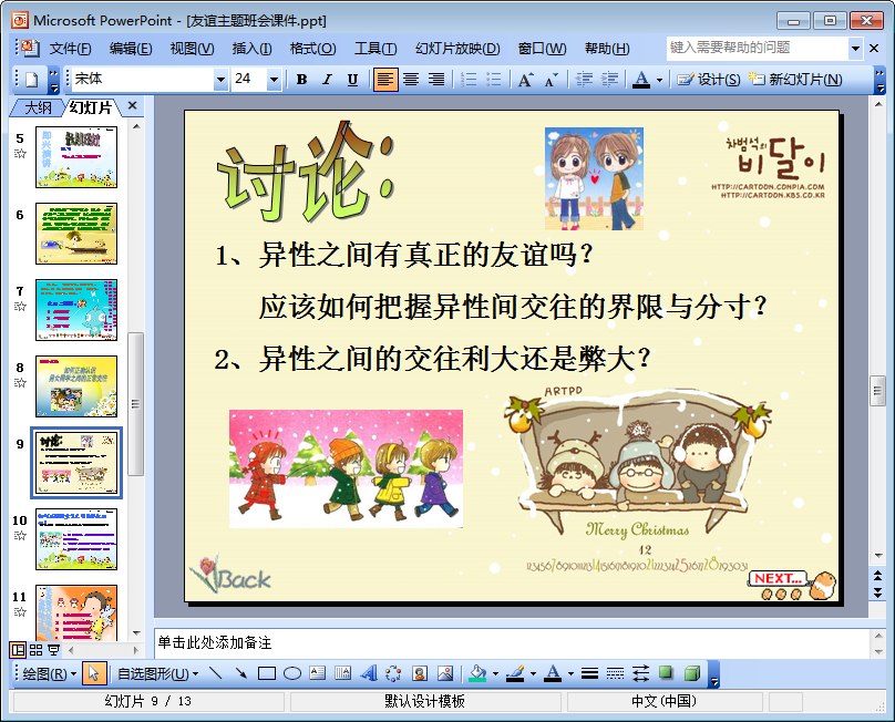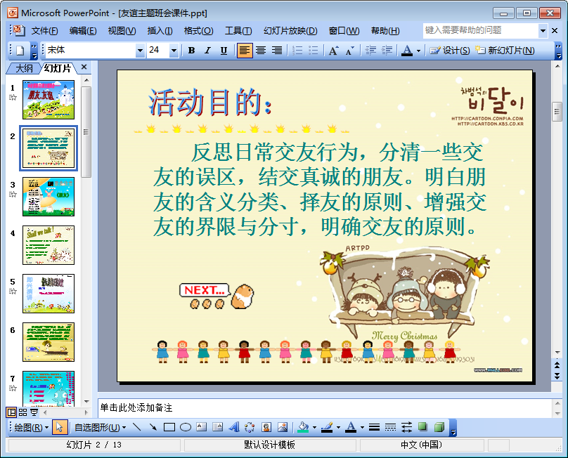 这份由13页组成的友谊主题班会ppt课件共由13页组成,该ppt课件旨在让学生反思日常交友行为并分清一些交友的误区从而结交到真诚的朋友。该ppt课件内容包括明白朋友的含义分类、择友的原则、增强交友的界限与分寸,明确交友的原则等,是一份十分具有教育意义的主题班会可以,如果你需要这份ppt课件的话,