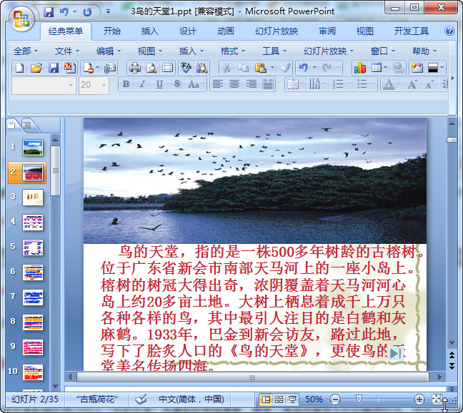 鸟的天堂ppt课件,一款非常精美的小学四年级上册语文ppt课件。可以作为说课ppt来做演示哦。非常的优秀呢。对于你不需要的内容可以直接替换掉哦。