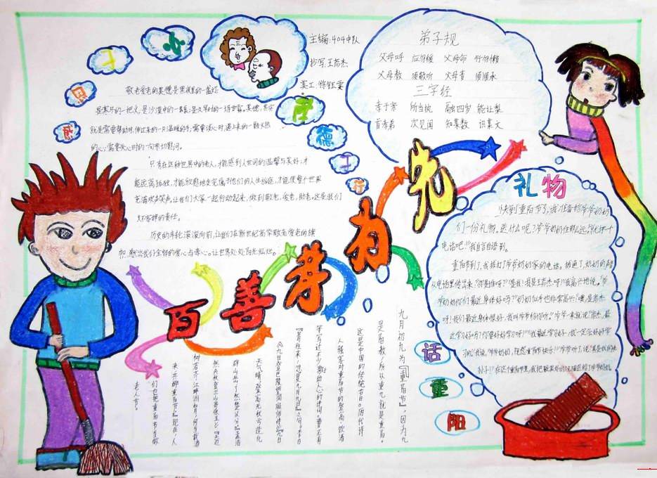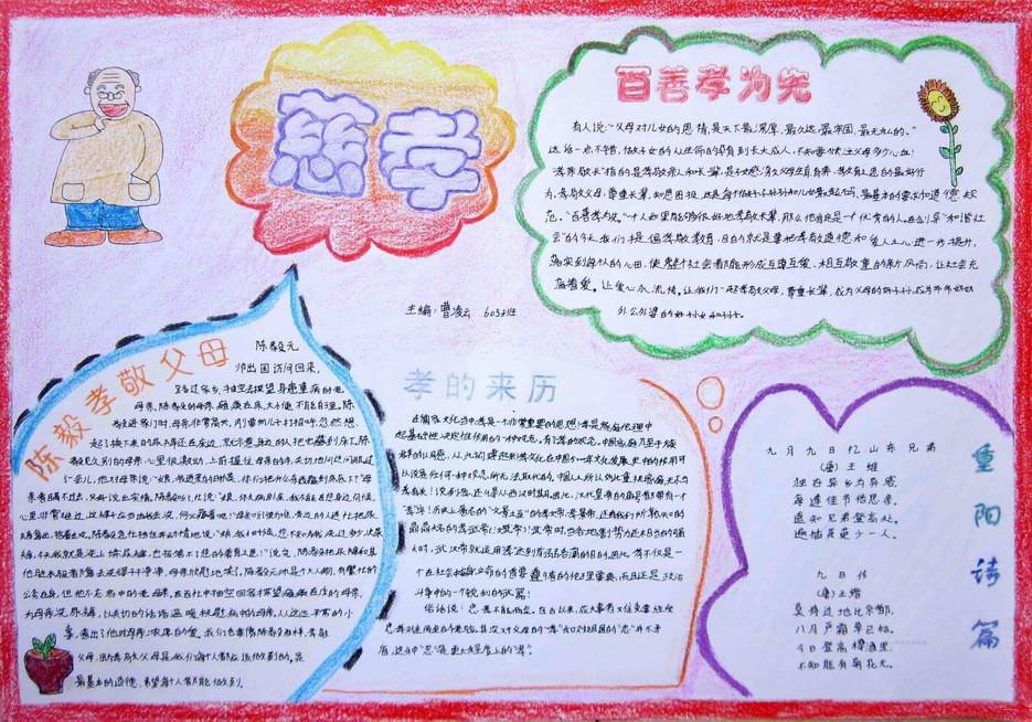 孝道手抄报大全,从羊有跪乳之恩到李密《陈情表》侍亲至孝,从鸦有反哺之孝到孔子“百善孝为先”。感恩慈孝,一直是中华传统之美德,更是做人之基本准则。胸怀感恩慈孝之心,饮水思源,进而知恩尽孝不忘本,均乃中华孝道之本,也为徳之本。慈孝不仅是人之美德,也是中国人品德形成基础,更是当今政治文明、经济文明、精神文明建设不可忽视的精神支柱和精神力量。