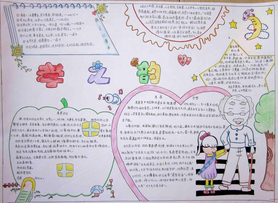 孝道手抄报内容大全里面关于孝的故事,还有一些关于孝道的名人名言,还有一些孝的思想和当代的一些事迹。非常的多哦。欢迎前来东坡下载使用。