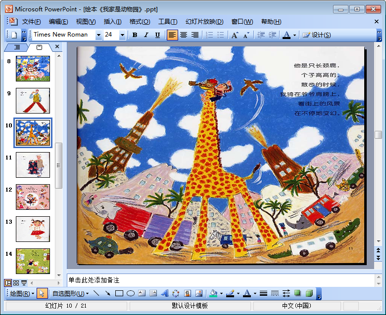 他是只长颈鹿,个子高高的。散步的时候,我骑在爷爷的肩膀上,看街上的风景在不停地变幻。