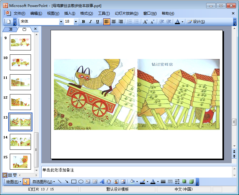 母鸡继续往前走,她钻过蜜蜂房。狐狸趴在小推车上,“轰”的一声撞倒了蜜蜂房。蜜蜂房里的蜜蜂“嗡嗡”的纷纷地向狐狸飞去,狐狸撒开四条腿飞快的没命逃走。