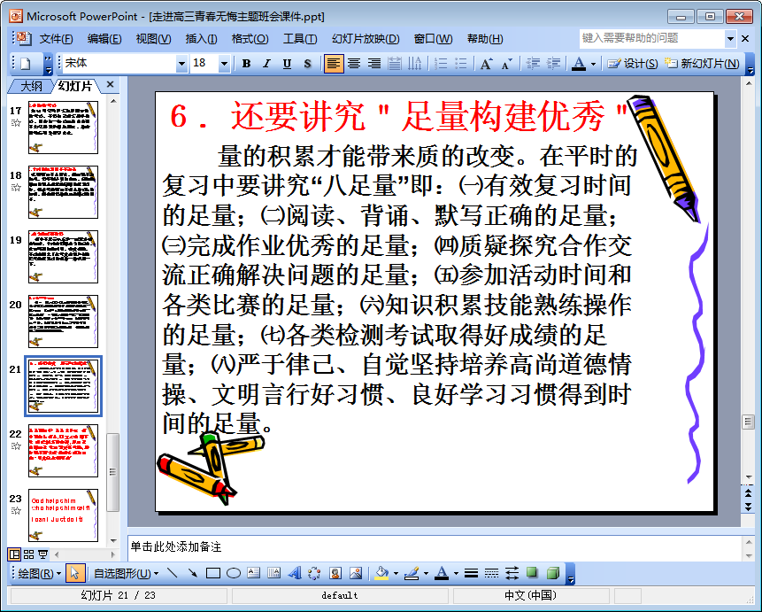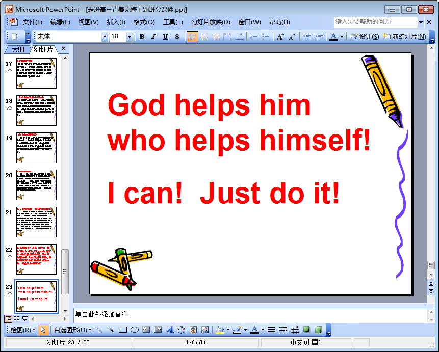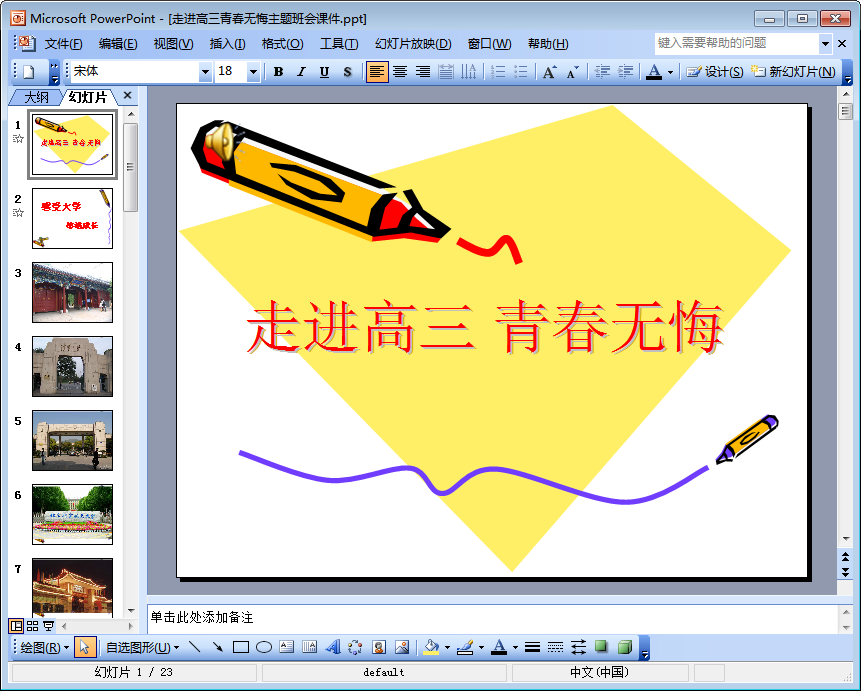 给高三的学生们加油或是鼓励是十分重要也是十分必要的,而加油或是鼓励的方法其实也有很多,比如一对一面谈,比如一起开个班会的“全班谈”,本节内容东坡小编为大家整理带来的是一份适合在“全班谈”的时候拿出来进行演示的、十分励志的名为“走进高三青春无悔”的主题班会课件(以下简称为走进高三ppt),下文是该ppt内容的摘选及预览图,欢迎有需要的朋友们前来下载使用该ppt!