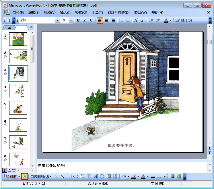 你看这只小老鼠吃完了饼干,还想要一杯牛奶,而等你给他牛奶后,他会跟你要根麦管。
