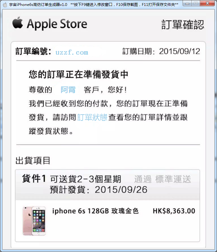 宇宙iPhone6s高仿订单生成器为高仿iphone6s订单生成工具,顾名思义,可以生成以用户姓名和随意订单号码的iPhone6s出货单(订单)。软件小巧、简单易用、安全绿色无病毒。为了保证图片的分辨率,软件界面大小默认为685*800,使用软件前可以选择性地将屏幕分辨率改高一点,方便使用!