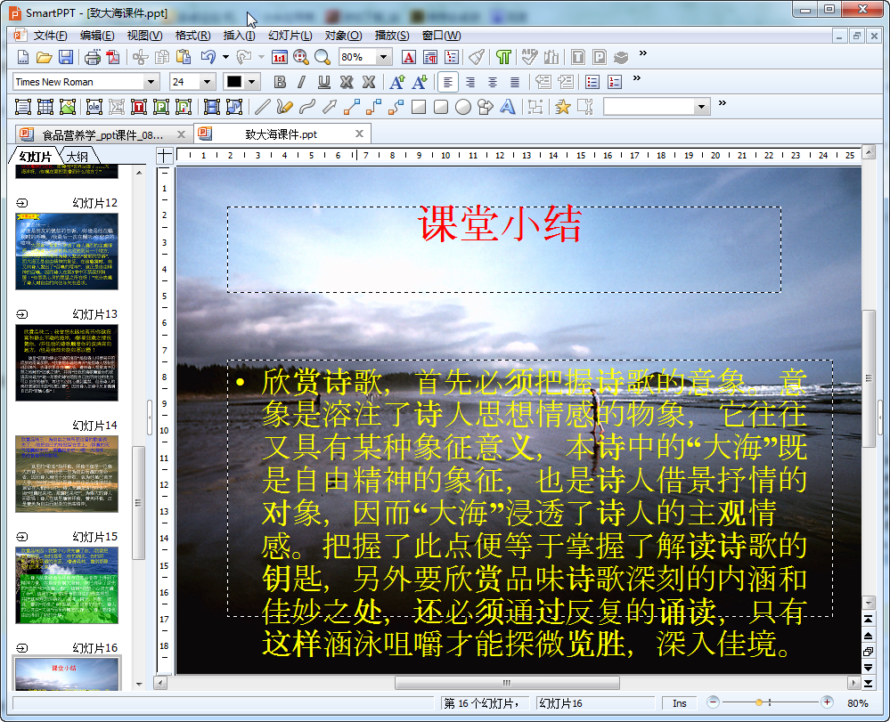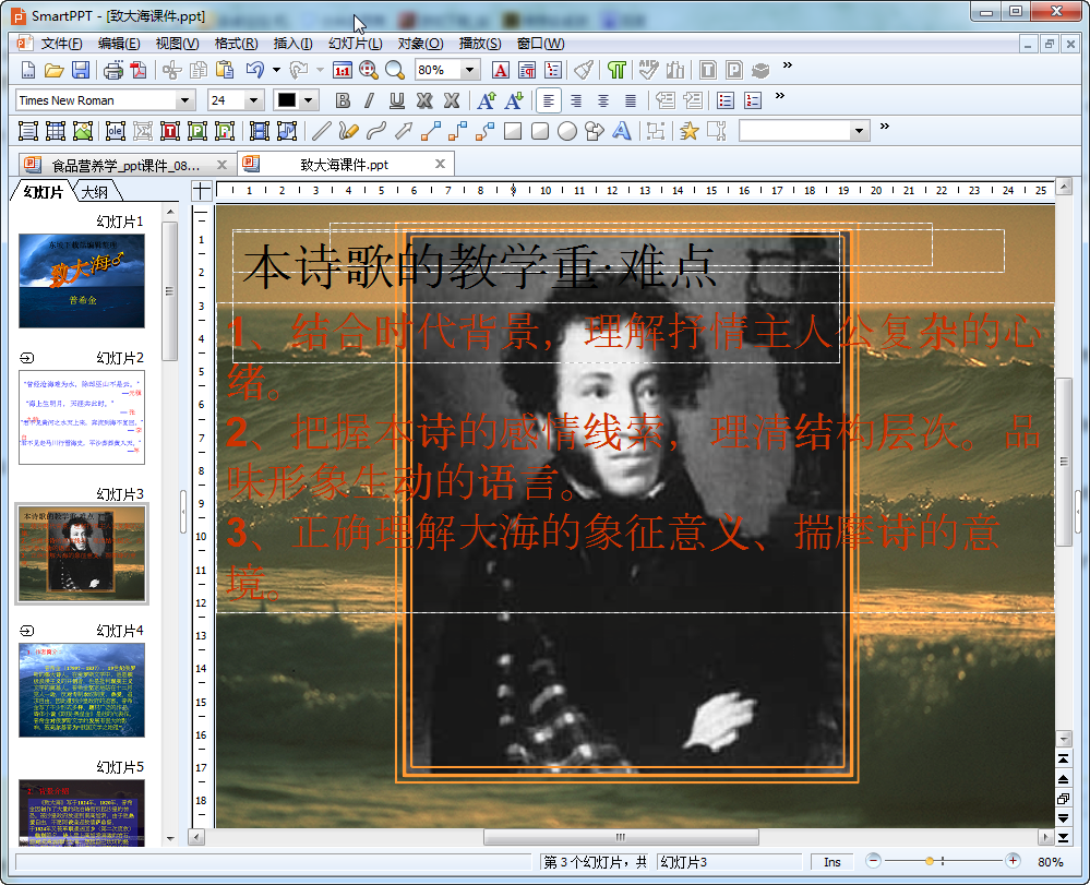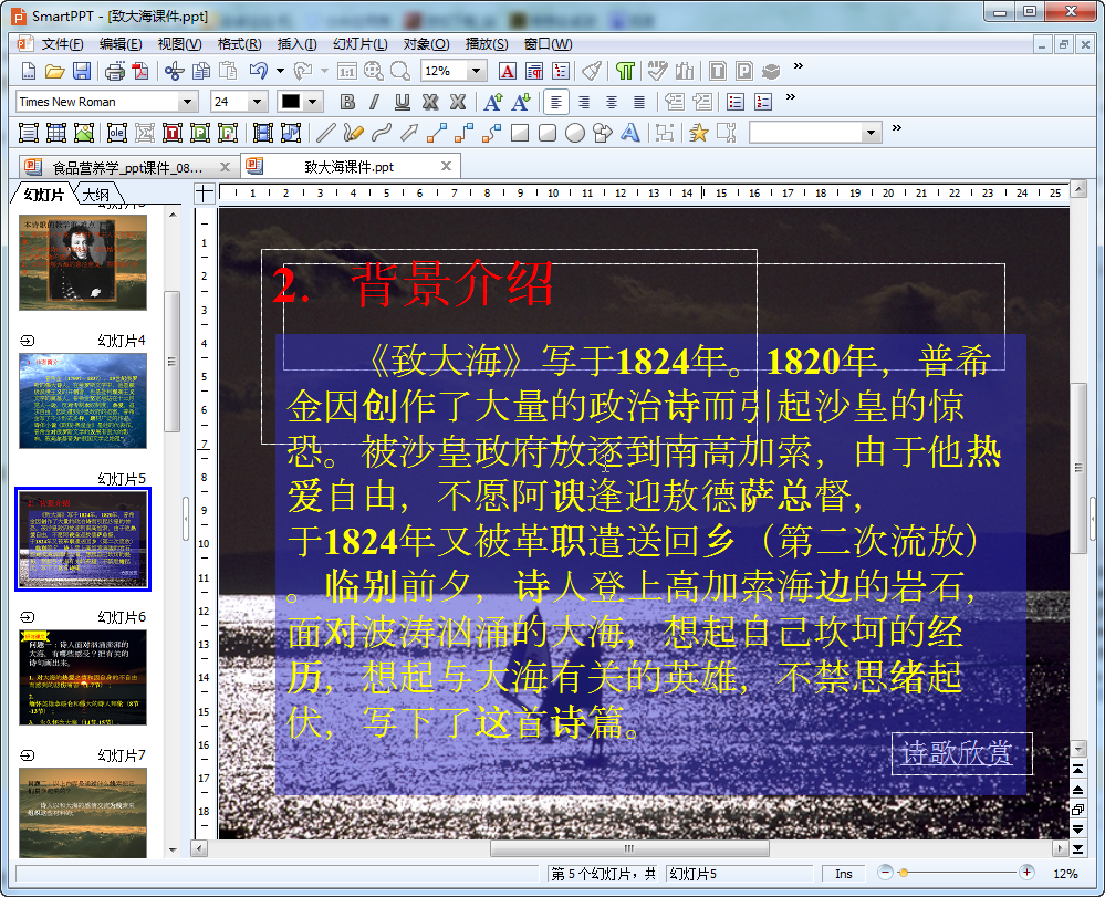 欣赏品味三:为自由之神所悲泣着的歌者消失了,/他把自己的桂冠留在世上。/阴恶的天气喧腾起来吧,激荡起来吧:/哦,大海呀,是他曾经将你歌唱。
